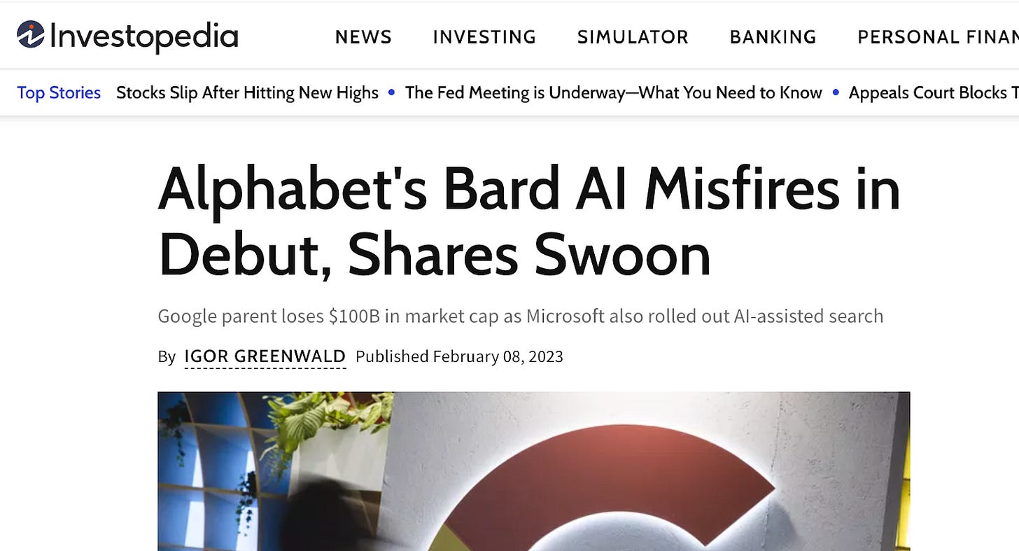 When it came time for the big reveal…well, it was kind of shaky. There was a factual error in its very first public demo, which sent Alphabet’s ($GOOG) tumbling, wiping out $100B in market value. You can read one of the articles talking about this during that time — this one is from Investopedia.
