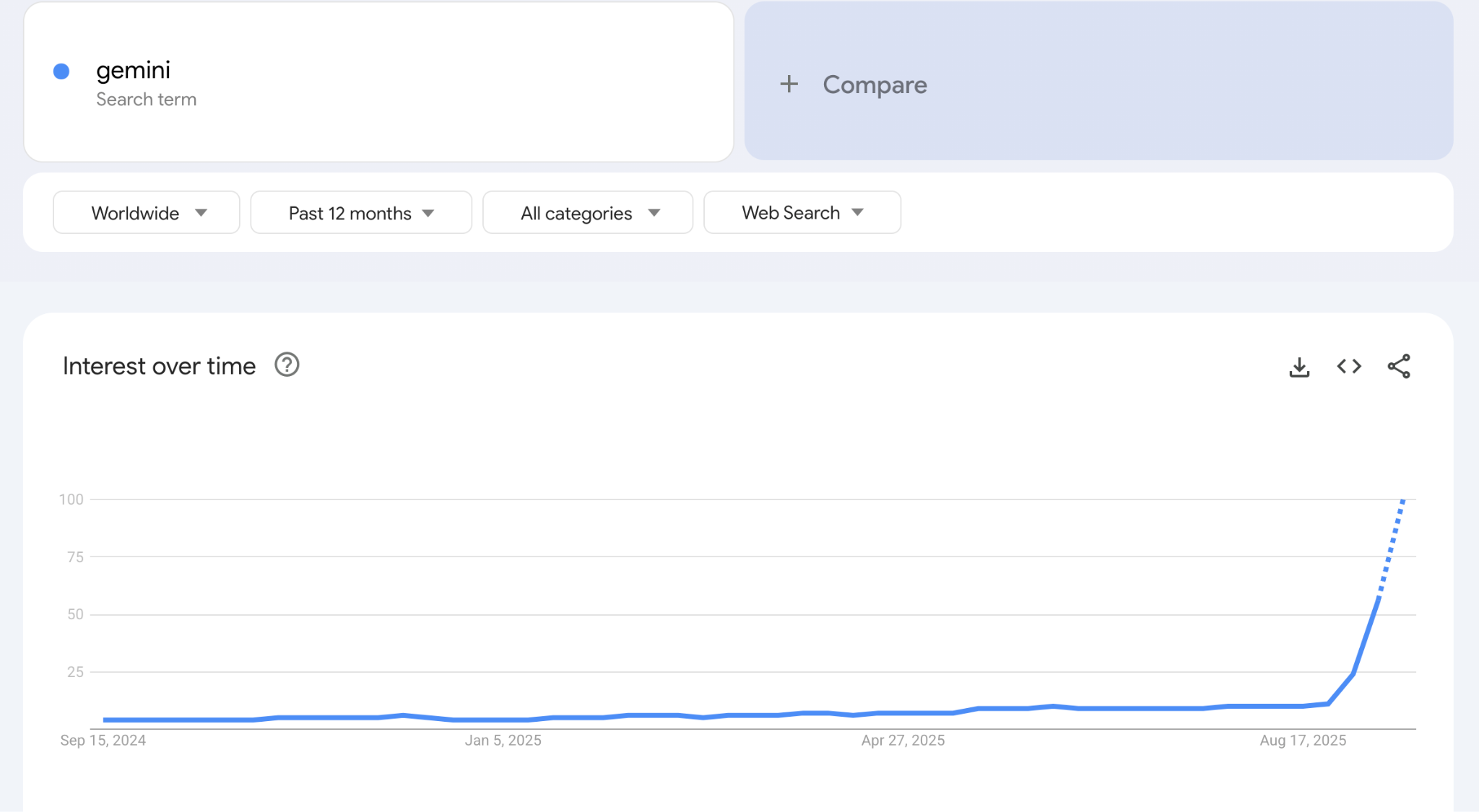 Also, another interesting observation: the “gemini” keyword is on the rise according to Google’s keyword trends. It’s fair to say that it’s entering the zeitgeist alongside ChatGPT and becoming one of those generational products.