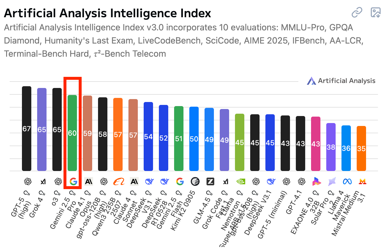 As of September 2025, you can see how quickly Google has been able to catch up, just trailing behind ChatGPT-5 and Grok 4 in just two years.