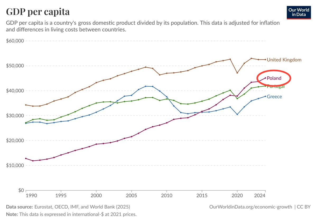 According to data from the International Monetary Fund, Poland’s GDP in 1990 was a mere US$6690 in current dollars. By 2024 it grew almost eight-fold to US$51,630 in terms of purchasing power parity. All that in just three decades, or one generation. And it goes on. According to the European Commission’s forecast, in 2024–25, the Polish economy will be the fastest growing large economy in the European Union.
