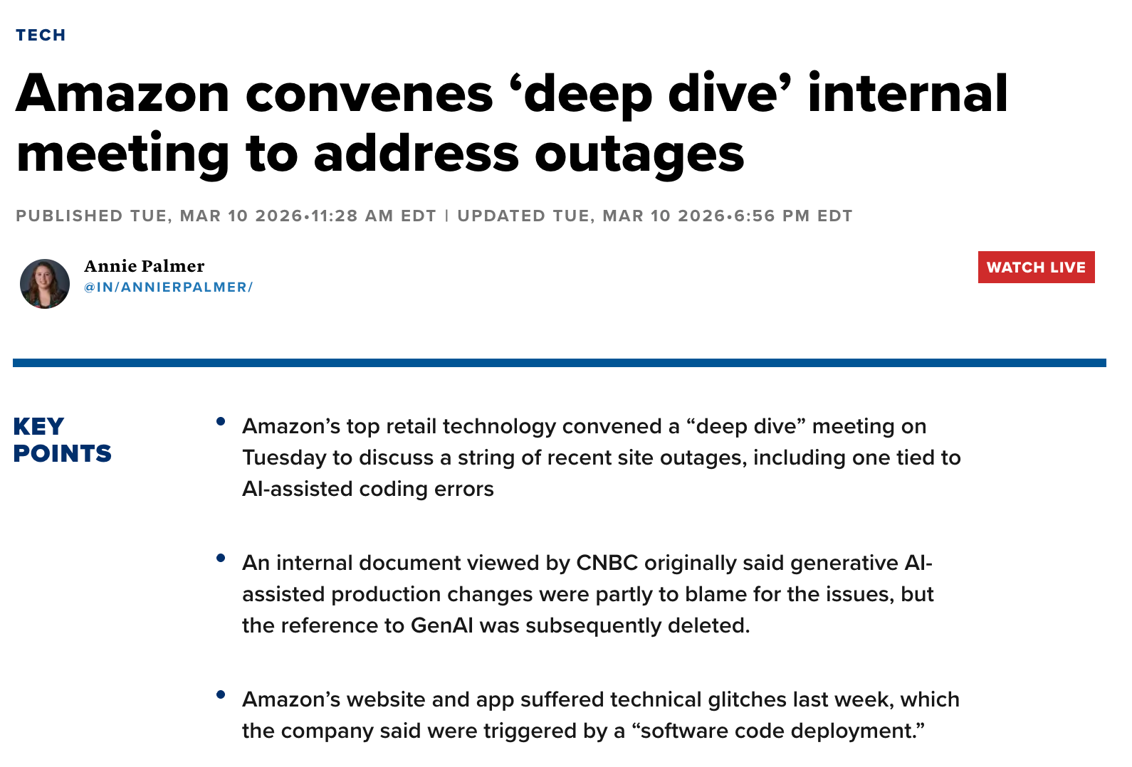 Recent outages across AWS have been traced directly back to Gen-AI-assisted infrastructure changes (although Amazon disputes this, as they obviously would). It turned out that support engineers used Amazon’s in-house coding assistant (Kira) to quickly generate and update complex infrastructure. It’s becoming clearer that developers are now being lulled into a false sense of security by AI’s confidence.
