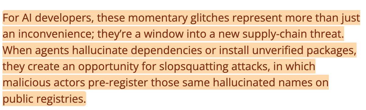 There’s also this phenomenon called “slopsquatting”, and this is where vibe coding crosses from just “frustrating” to “actively dangerous” territory. You should read this fascinating piece from Trend Micro on when AI agents start to hallucinate on code dependencies.